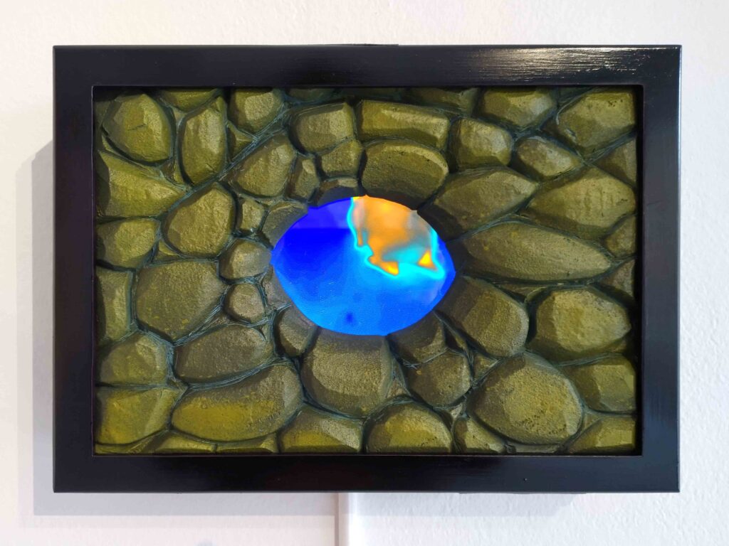 The artpiece aims to capture the sensory world of a snake using a thermal image of the snakes' natural prey, rabbits. The thermal image is presented on an snake-eye-shaped screen.